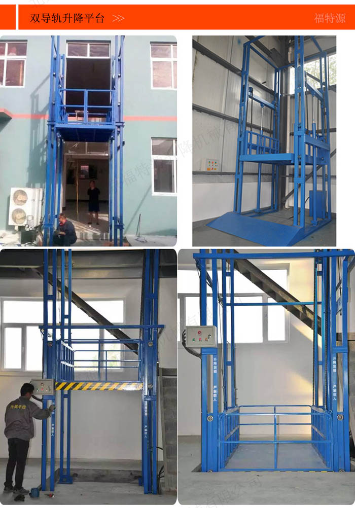 導軌式升降機是一種非剪叉式液壓升降機械設備·用于二三層工業廠房,餐廳,酒樓樓層間的貨物傳輸·高度在150-300mm,尤其適合不能開挖地坑的工作場所·并且無須上部吊點形式多樣化(單柱,雙柱,四柱).設備運行平穩,導軌式升降機的導軌一般為槽鋼、工字鋼,方管焊接制成,操作簡單可靠,貨物傳輸經濟便捷。